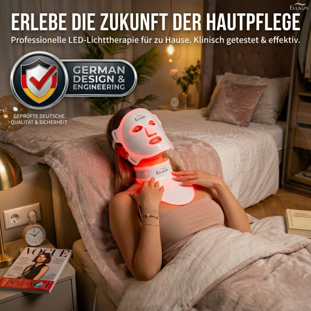 Unsere ELLAGIN LED-Gesichts-,Hals und Dekolletémaske vereint modernste Technologie mit höchstem Komfort.